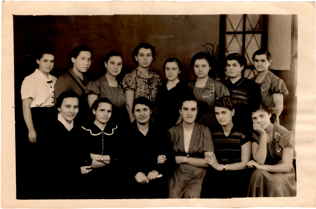 Євгенія Радовець (третя справа у першому ряду) серед товаришок, місто Прокоп’євськ у Кемеровській області, 1950-ті роки