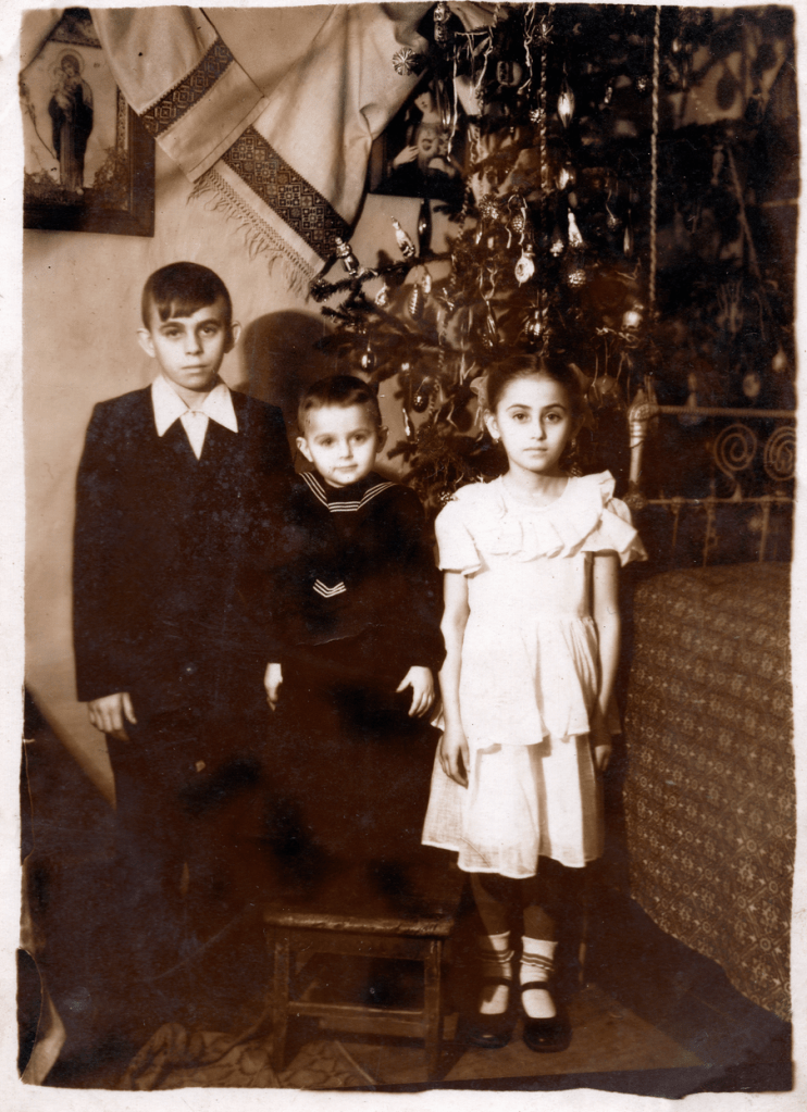 Трійка маленьких дітей, вбрані у святковий одяг, вишикувалися перед камерою. Старший хлопчик зосереджено і спокійно дивиться в камеру, нерівна гривка збилася на бік. У дівчинки у вухах сережки, у волоссі заплетена стрічка, новенькі туфлі контрастують з білими шкарпетками. Найменший хлопчик стоїть на стільчику. На тлі рясно прикрашена скляними фігурками ялинка, серед яких можемо розгледіти кількох Дідів Морозів, Снігуроньку, бурульки, шишки. На стіні висять ікони в рушниках. Роздивляючись численні деталі на цій світлині, можна не зрозуміти, що вона зроблена на спецпоселенні. Так відбувається тому, що кожна окрема вернакулярна фотографія може не мати одночасно усіх (або іноді навіть жодного) візуальних маркерів, за якими ми атрибутуємо світлину як таку, що документує певну подію, місце чи належить до певного періоду. Проте ми не можемо відокремити зображення від умов, в яких воно було створено і обставин, за яких воно циркулювало.