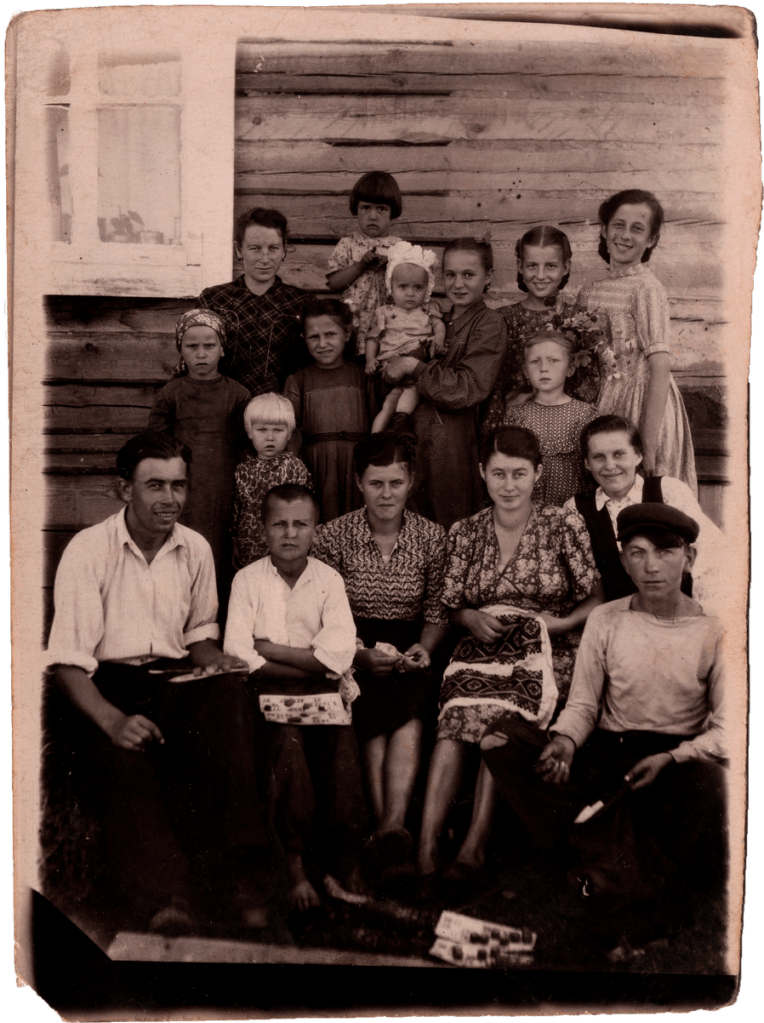 Групова світлина, зроблена на тлі бараку, дає доволі багато інформації про побут людей, яких депортували. Бачимо фіранки на вікні і декілька горщиків (а радше жерстянок з-під консервів) з рослинами на підвіконні. Листя однієї з рослин нагадує бегонію. Якість знімку дозволяє розгледіти, що деякі жінки носять сережки. Одяг людей, що зібралися, виглядає дуже по-різному: бачимо як дівчат у гарних сукнях, так і хлопця у дуже рваній одежині. Одна з жінок тримає у руках вишивку (рукави майбутньої вишиванки?), інша — плетене мереживо, комірець чи серветку. Хлопці тримають лото, а один з них — ніж, яким, можливо, щойно щось вирізав. Видно, що композиція світлини старанно продумана і усі учасники готувалися до фотографування.