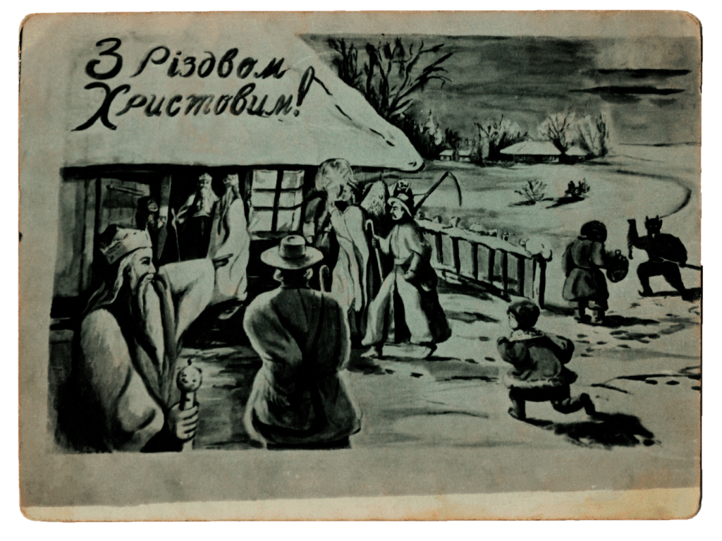 Різдвяна листівка — це фотокопія. На ній ми бачимо чи то вертеп, чи то справжніх трьох волхвів біля засніженої української хати. Поруч вештається чорт, видно також інші традиційні фігури вертепу — смерть з косою і зірку. Один з волхвів показує на світло, яке вибивається з вікна хати, пояснюючи щось селянинові, який, вочевидь, щойно підійшов, до хати також поспішають інші люди. Можливо, за задумом художника різдвяне диво сталося саме тут? Для людини, яка відсилала цю листівку, було вочевидь важливим, що зображення на ній нагадує її дім. До речі, якщо придивитися, на обрії можна помітити церкву з хрестом.