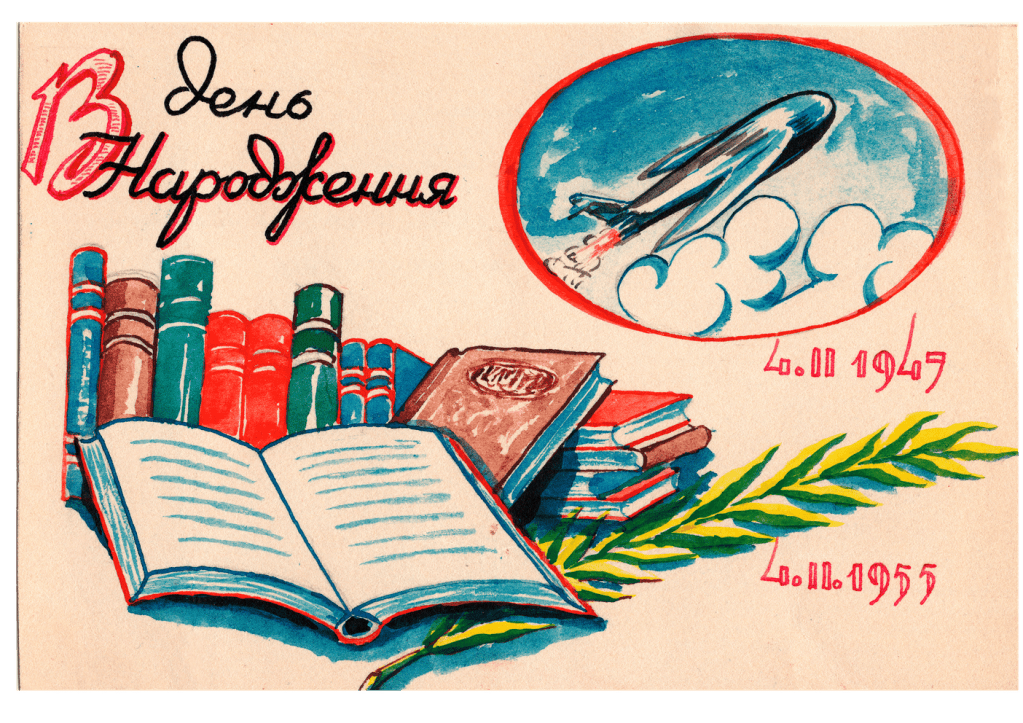 Як надіслати з ГУЛАГу листівку рідним, якщо ніяких листівок там, звісно, немає? В’язні давали собі ради з цим підручними засобами: привітання з днем народження сина – це старанно намальована фарбами стилізація під типову радянську листівку з дописаною фломастером датою. Бачимо тут стос книжок і літак, який здіймається вище хмар — це можна зрозуміти як побажання.