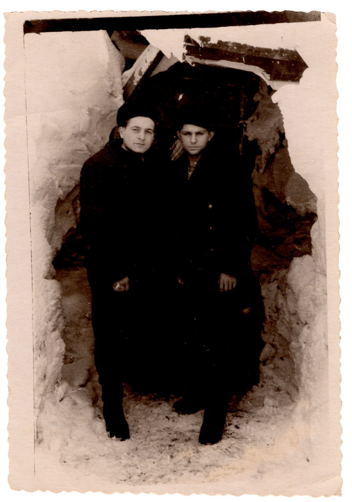 Михайло Куцяба (праворуч) з товаришем у Кемеровській області, 1953 рік