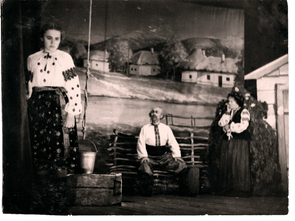 Мирослава Сахаревич (ліворуч) в образі Наталки з п’єси «Наталка Полтавка», селище Зирянське у Томській області, перша половина 1950-х років