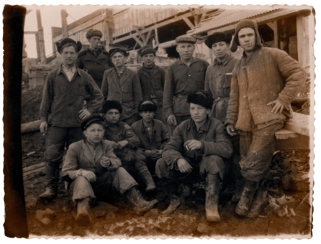 Степан Притула (перший зліва у першому ряду) з колегами по роботу у будівельній бригаді, місто Прокоп’євськ у Кемеровській області, початок 1950-х років